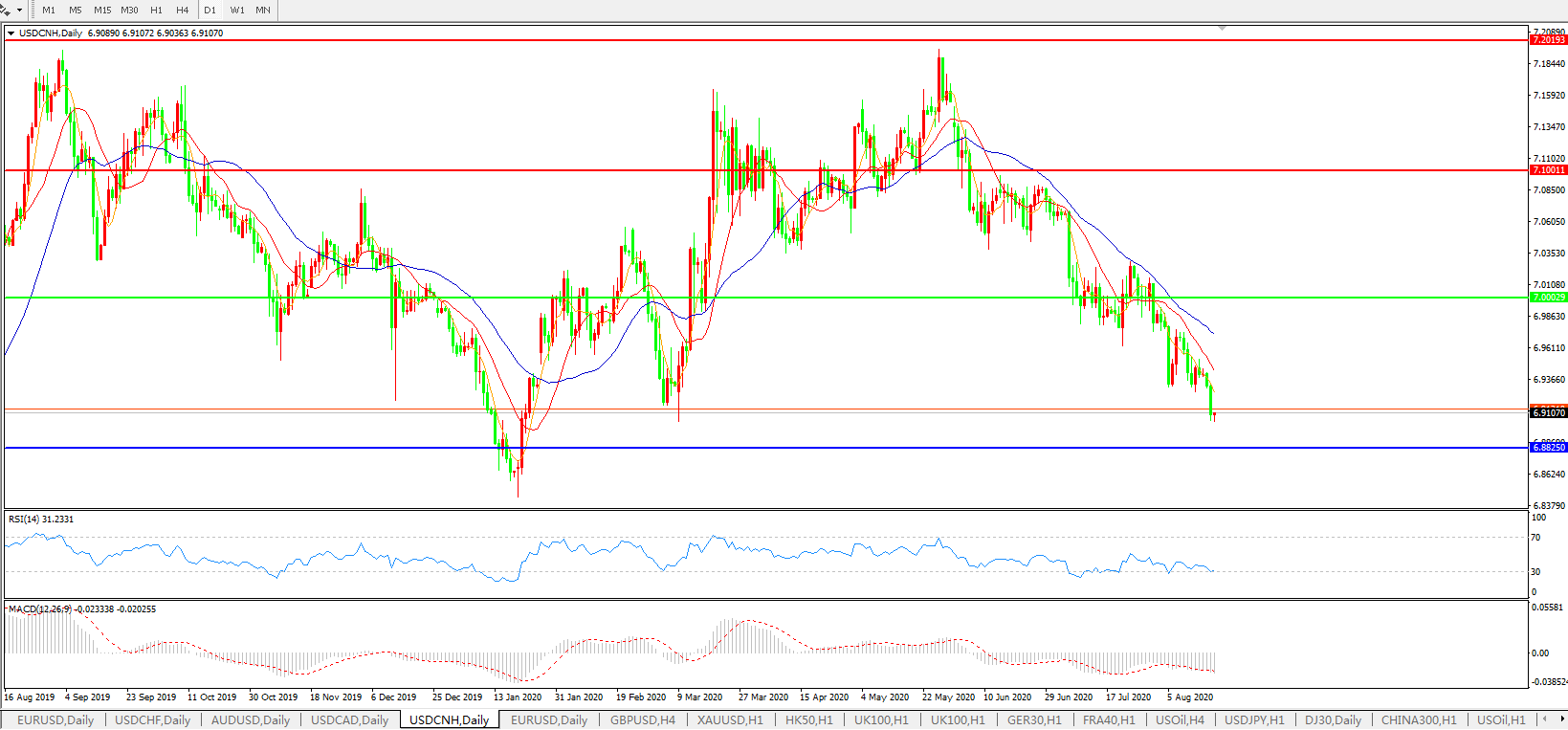 美元兑人民币USDCNH 日线图:
