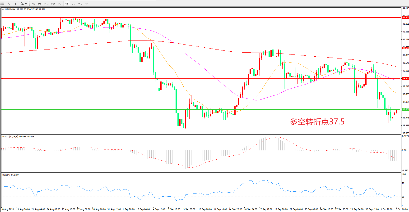 4小时图看,油价长阴下破,整体表现十分低迷,37.5美元成为多空分水岭,均线系统呈空头排列,MACD绿柱增加,RSI指标走平,日内延续下行概率较大。