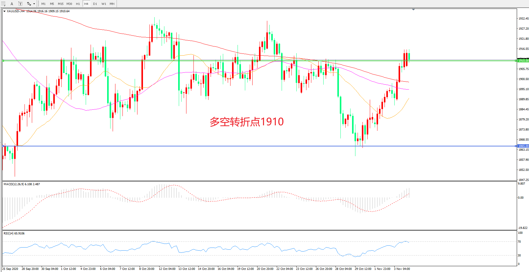 周二(11月3日),在美元下挫、市场乐观预期美国新刺激出台和美联储保持超级宽松的推动下,现货黄金连续第三个交易日收涨,大幅上行后收报1914美元/盎司。目前的民调普遍预计,民主党参选人拜登将有望入主白宫,民主党甚至有望夺回参议院的控制权,由此,市场期待已久的新一轮刺激法案将有望在不久的将来推出,对未来通胀的预期推动了金价走高。