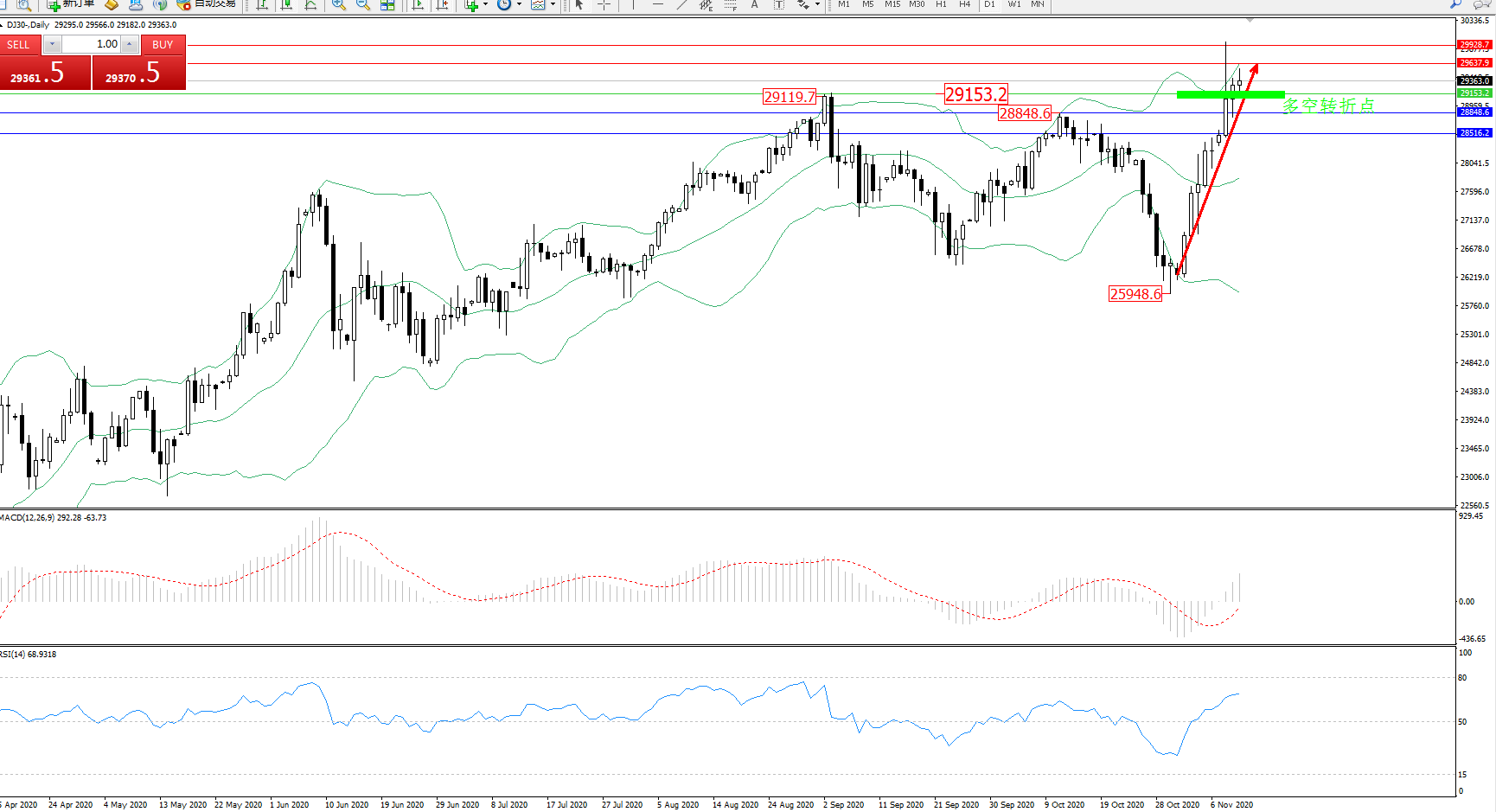 道琼斯指数11月11日(周三)收盘下跌23.30点,跌幅0.08%,报29397.63点。美股三大指数收盘涨跌不一,大型科技股领跌;在新冠病例激增之际,投资者猜测市场本月的反弹幅度相对于经济好转的前景而言已经过头。科技股下跌抵消了能源和工业股的上涨,道琼斯工业平均指数表现较好,得益于波音公司继续走高;在各种乐观情绪推动全球股市上涨并导致避险资产大幅下跌之后,市场可能已经反应过度。冠状病毒疫苗面世仍然存在一些障碍,另外投资者对于财政刺激政策,向当选总统乔·拜登的权力交接,以及新冠疫情加重,都存在着担忧。疫苗专家说,即使一些数字看起来非常令人有盼望,但有关疫苗的生产,分配,以及最重要的是其本身的表现和功能等问题仍需要回答。疫苗新闻将关注点拉回美联储,认为美联储在可预见的未来将保持超宽松政策,这可能会限制利率上升,帮助实际利率恢复下降趋势。