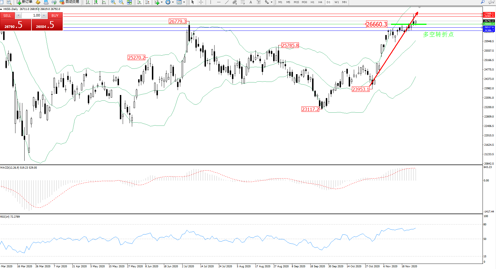 香港恒生指数11月26日(周四)收盘上涨149.70点,涨幅0.56%,报26819.45点;港股主要指数均收涨,恒指尾盘拉升,恒生科技指数涨1.71%。阿里概念股领涨,阿里健康尾盘急升,收涨近8%;恒生科技股大多上涨,美团劲升4.9%,腾讯、小米、京东皆有涨幅;手游股全天弱势领跌,汽车股全线回落,北京汽车跌4%;猪肉概念股、光伏股、家电股普跌。今日南下资金净流入25.53亿港元,大市成交额为1136.39亿港元。美国感恩节美国股市将休市一日,港股预托证券个别发展,预料大市早段缺乏方向。受外围带动,港股走势向好,指数一度突破27,000点水平,其后跟随内地股市回软,尾市升幅显著收窄,大市成交持续活跃。个股表现差异较大,传统类股份表现向好,新经济股则走势受压,预料短期指数将进入整固格局,维持于26,000至27,000点水平上落。