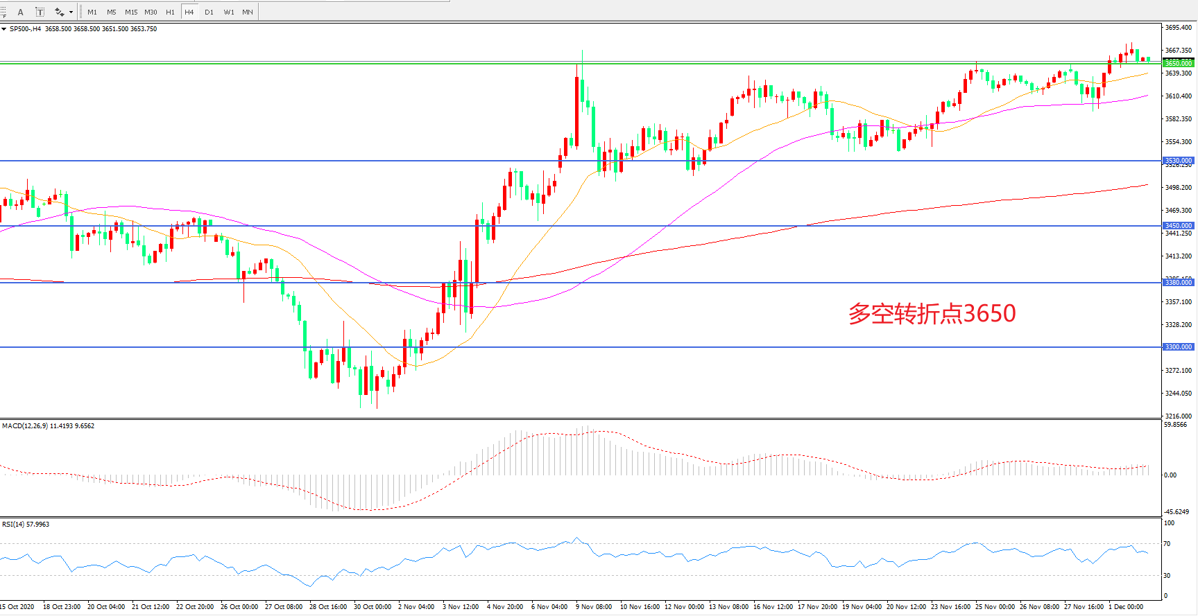4小时图看,标普500震荡突破,上行趋势稳健,3650成为短期多空分水岭,21周期均线成为短期支撑, MACD红柱增加,RSI指标向上,日内延续上行概率较大。