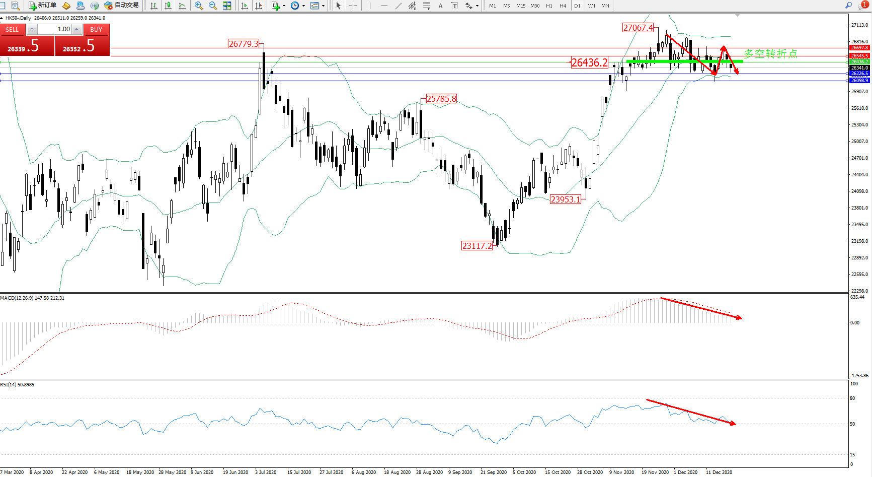 香港恒生指数12月21日(周一)收盘下跌191.92点,跌幅0.72%,报26306.68点;港股主要指数全天低迷,尾盘跌幅明显扩大。恒生科技指数跌1.14%报8159点。银行股、蓝筹地产股、电信股等权重疲弱拖累大市走低,汇丰控股跌4%表现最差,拖累恒指下跌85点;大型科技股阿里跌超2%,腾讯跌1.4%,小米收涨1.74%,盘中创下新高价;今日南下资金净流入27.85亿港元,大市成交额为1438.84亿港元。英国封锁引发市场恐慌,市场担忧新冠出现变种,欧洲各国或许会实施更严格的封锁措施。香港食物及卫生局局长陈肇始表示,英国变种病毒来势汹汹,港府将在周二(22日)凌晨零时起,过去14天曾于英国停留超过两小时的人,会被禁止登机来港,包括香港居民。另外,港府要求英国抵港者,在完成14天酒店检疫后,亦须留家7天,直至第19至20天病毒检测得出结果,即检疫期共21天。相关措施明日起生效。