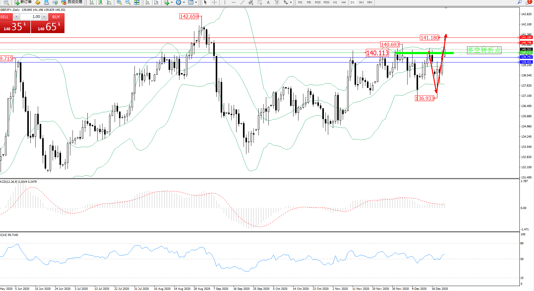 技术点评:长时间处于布林带指标通道内宽幅震荡上扬走势持续,期间多次来回试探上下轨区间节点,多头动力突破上轨后抵达141.180位置后出现短暂回撤,多头动力仍有上扬潜力,MACD指标处于多头区域50均衡线上方维持窄幅整理平移中,RSI指标处于50均衡线附近震荡后出现向上移动中;