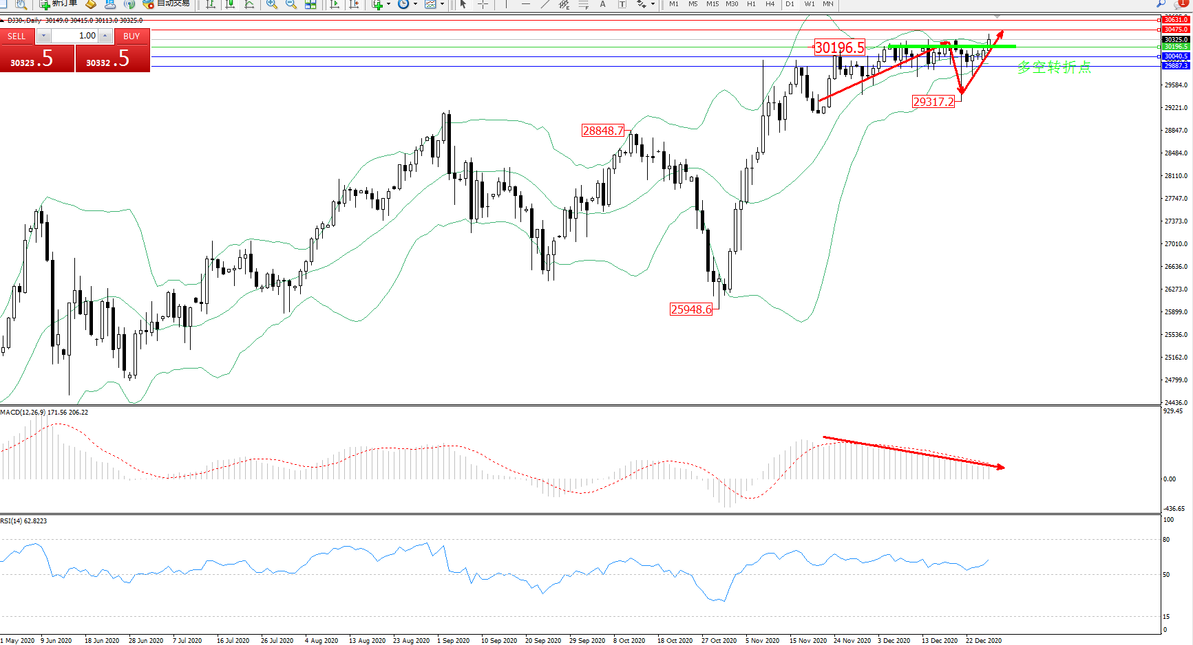 道琼斯指数DJ30—— 日K线图显示: