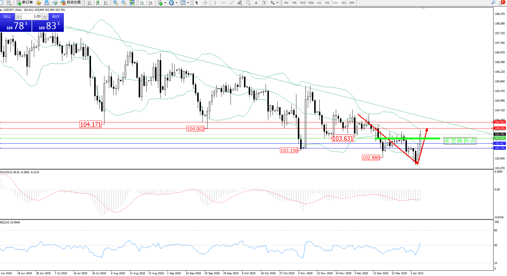 美元兑日圆底部强势按理说至103.781附近节点,隔夜以来受市场消息情绪反转影响,日元汇价已经开始承压下跌,一方面,美元指数在美国政局不确定性有望最终尘埃落定的背景下暂时触底回升,另一方面,日本本土近日爆发性新增的新冠病毒感染人数也令投资者感到忌惮,并且可能引发日本官方的进一步行动。推动美元兑日元进一步回升走强的消息便还在于,日本财务省、央行及金融听将于北京时间周四15点30分举行紧急会议讨论全球金融市场,这无疑也提升了日本官方考虑干预打压日元汇率的可能性。除此之外,日本本土的防疫形势以及相应的对策,也会在此后更加受到瞩目。