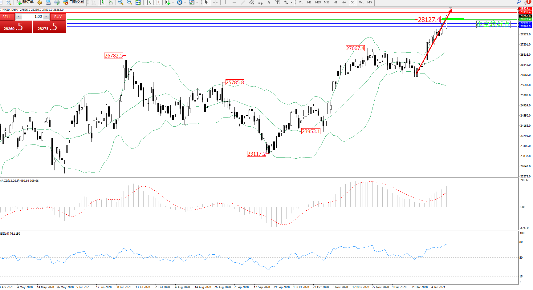 香港恒生指数1月12日(周二)收盘上涨368.53点,涨幅1.32%,报28276.75点;港股主要指数均收涨,恒指低开高走全天呈上升走势,时隔11个月重回28000点上方。恒生科技指数涨0.71%报8726点。盘面上,军工股与生物医药股全天表现强势,加科思-B等多股创新高价;电信股继续反弹上扬,三大电信股近乎收复日前跌幅;午后大金融股(保险、券商、银行)大幅拉升走高,助力大市稳步上行。大型科技股美团跌2.45%为最差恒指成份股,阿里、腾讯均小幅收跌。今日南下资金净流入117.36亿港元,大市成交额为1990.62亿港元,较昨日明显缩量。据香港电台网站,截至当日零时,香港新增60例新冠肺炎确诊病例,全部为本地病例,其中13例源头不明。据香港电台网站,截至当日零时,香港新增60例新冠肺炎确诊病例,全部为本地病例,其中13例源头不明。香港特区政府食物环境卫生署食物安全中心12日宣布,据世界动物卫生组织及韩国农林畜产食品部分别通报,法国Pyrénées-Atlantiques省和Hautes-Pyrénées省、英国北爱尔兰安特里姆郡中东安特里姆市、德国图林根州北豪森区、韩国庆尚南道晋州市和居昌郡暴发高致病性H5N8禽流感疫情,食物安全中心即时指示业界暂停从上述地区进口禽肉及禽类产品(包括禽蛋)。