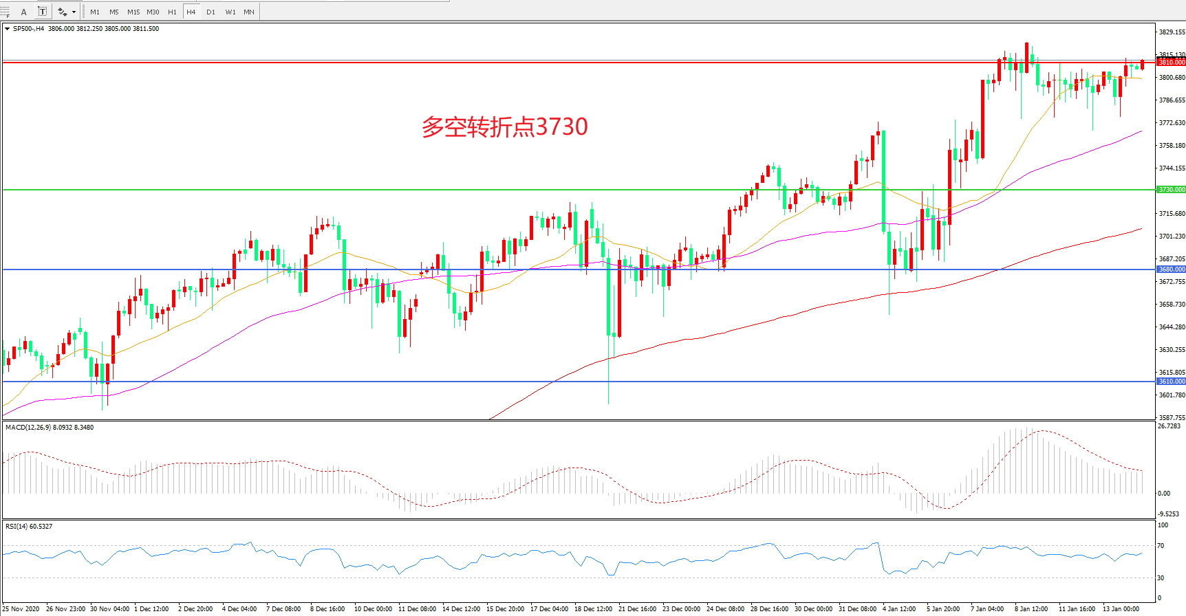 4小时图看,标普500延续高位震荡,短期涨势暂缓,3810成为短期阻力,但均线系统依然呈多头排列,MACD红柱减少,RSI指标走平,日内延续震荡概率较大。