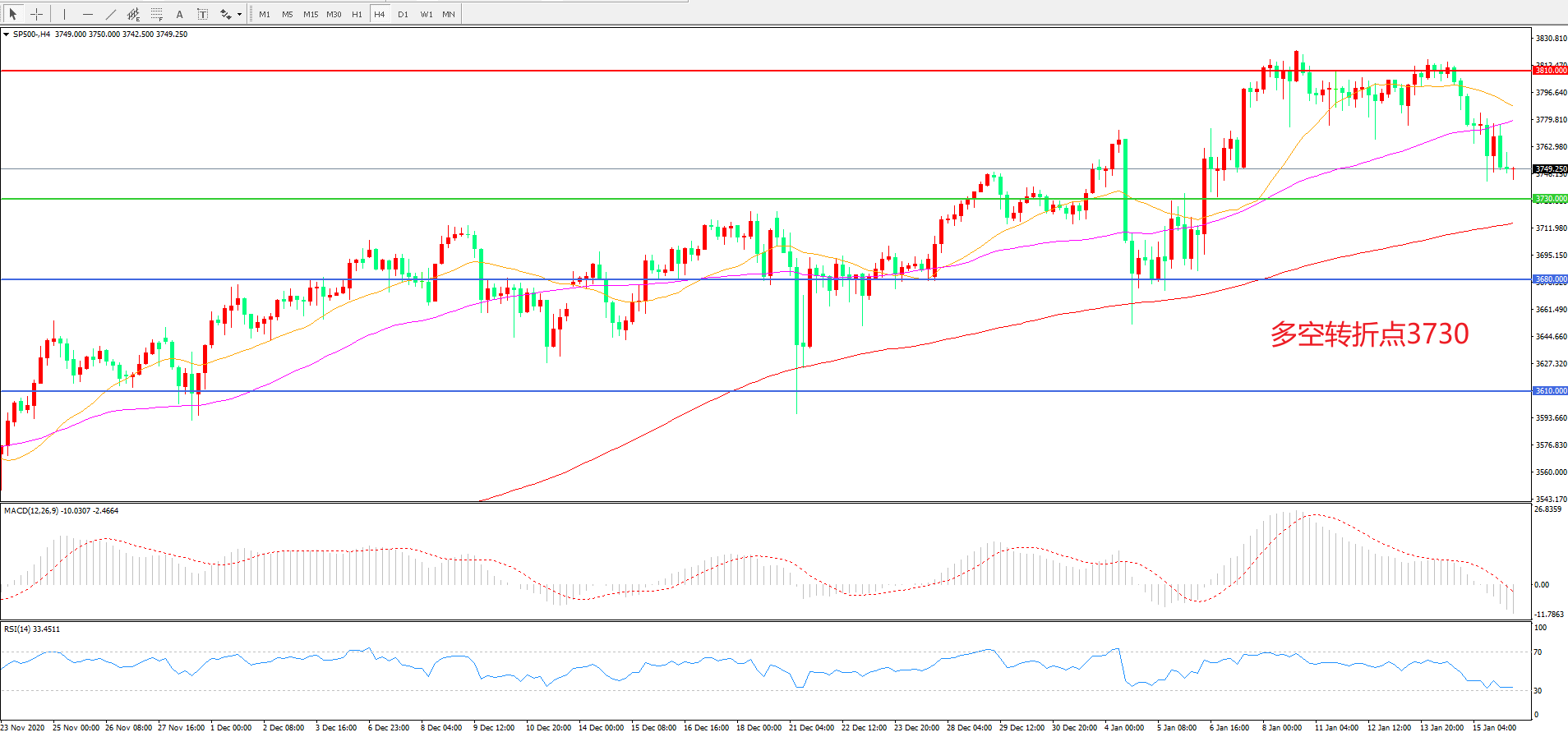 4小时图看,标普500触碰3810阻力后震荡回落,上行趋势遭到破坏,3810成为短期阻力,短期均线拐头向下,MACD绿柱增加,RSI指标走平,日内延续震荡概率较大。