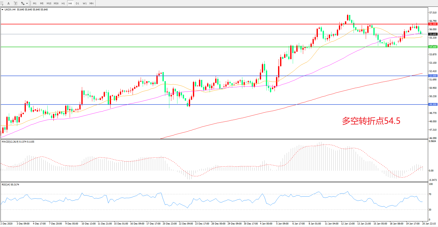 交易策略: 在54.50之上看涨,目标56.50 60.00