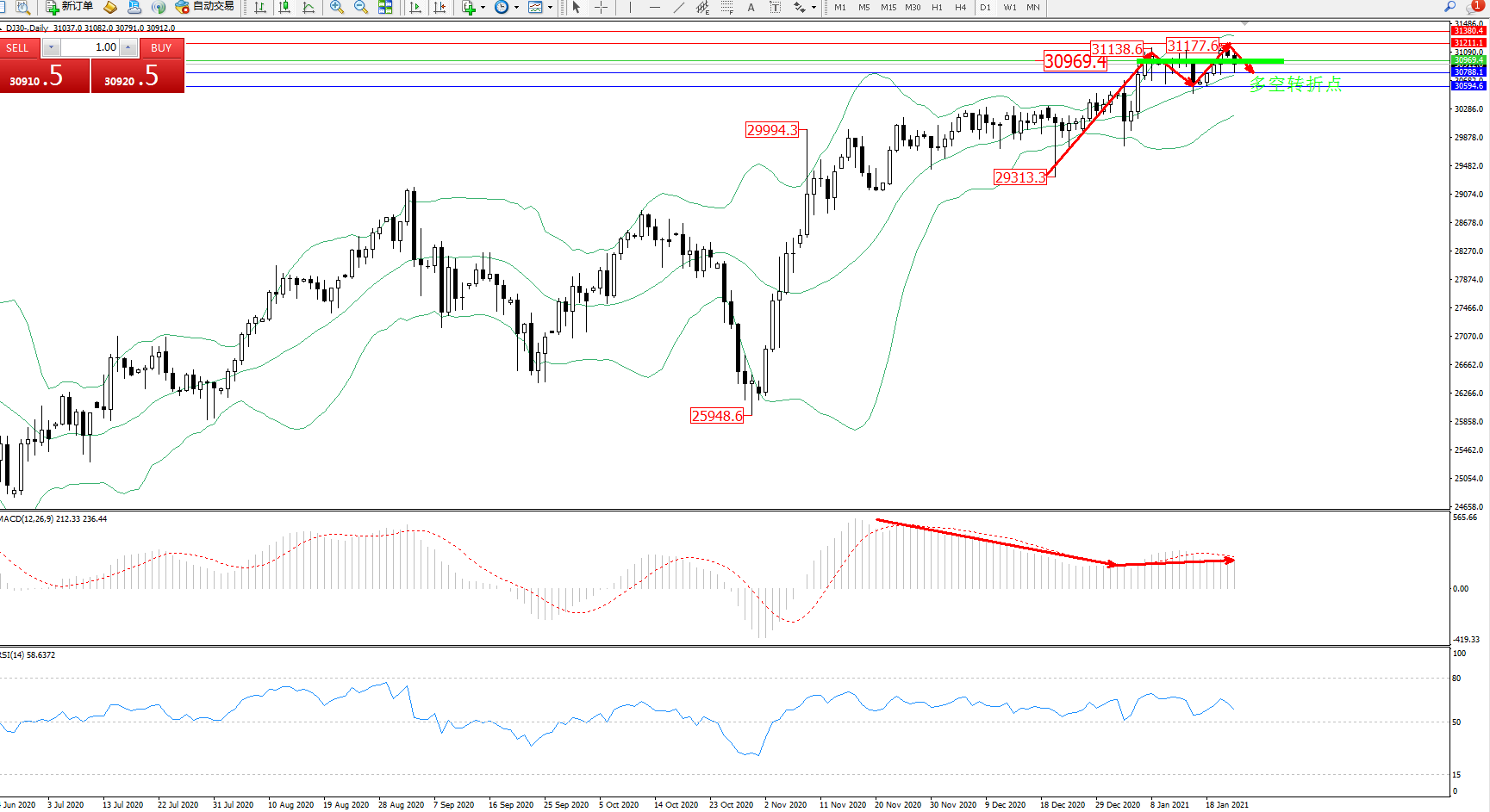 技术点评:多头动力延续布林带指标通道中上轨区间持续震荡上扬态势良好,高位抵达31138位置节点后遇阻开始短暂整理平移,触及中轨附近后再度向上移动,布林带指标呈张口走势后缓慢向上收口中,多头动力有继续向上移动走势,MACD指标处于0轴线上方多头区域维持整理平移中,RSI指标处于50均衡线上方多头区域持续弱势震荡中;