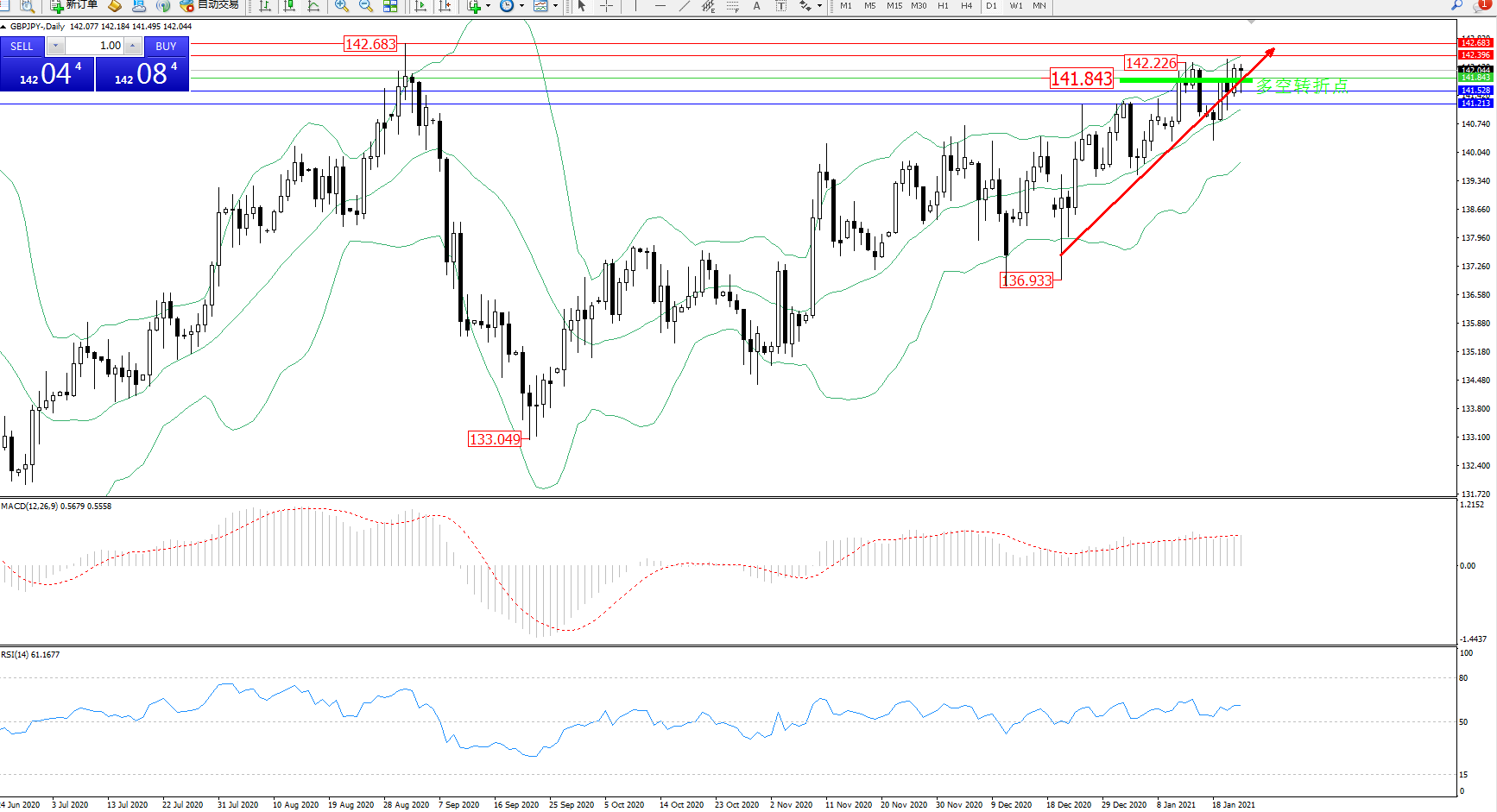 英镑兑日圆处于142.044附近震荡,英国首相约翰逊表示英国的冠状病毒新毒株的致命性可能超出了最初预期,并警告称政府决心避免过早解除封锁措施。英国第三度实施全国防疫封锁,已经导致商业活动创下5月以来最大幅度的下滑,其中服务业者受创最深。1月综合采购经理人指数(PMI)初值降至40.6,12月为50.4。除了最新的封锁措施外,英国退出欧盟后与欧盟的贸易安排增加了繁文缛节,也是造成数据下跌的原因。服务业再度受到严重冲击,制造业增长几乎停滞,这主要归咎于新冠疫情加上退出欧盟导致供应延误的情况越来越普遍、成本增加以及出口下滑。1月服务业PMI从12月的49.4降至38.8,为5月以来最低水平,且为连续第三个月萎缩。制造业表现则好得多,尽管产出增长消退且订单再度下降。1月制造业PMI从12月的57.5跌至52.9,仍高于荣枯分水岭50。