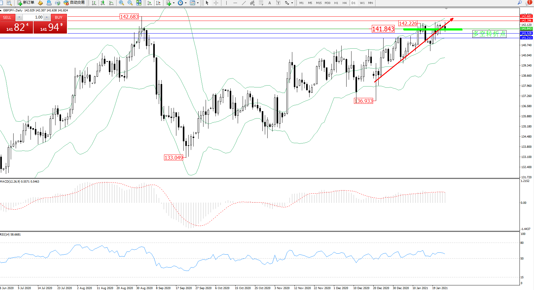 备选策略:141.843下方看跌,目标141.528、141.213