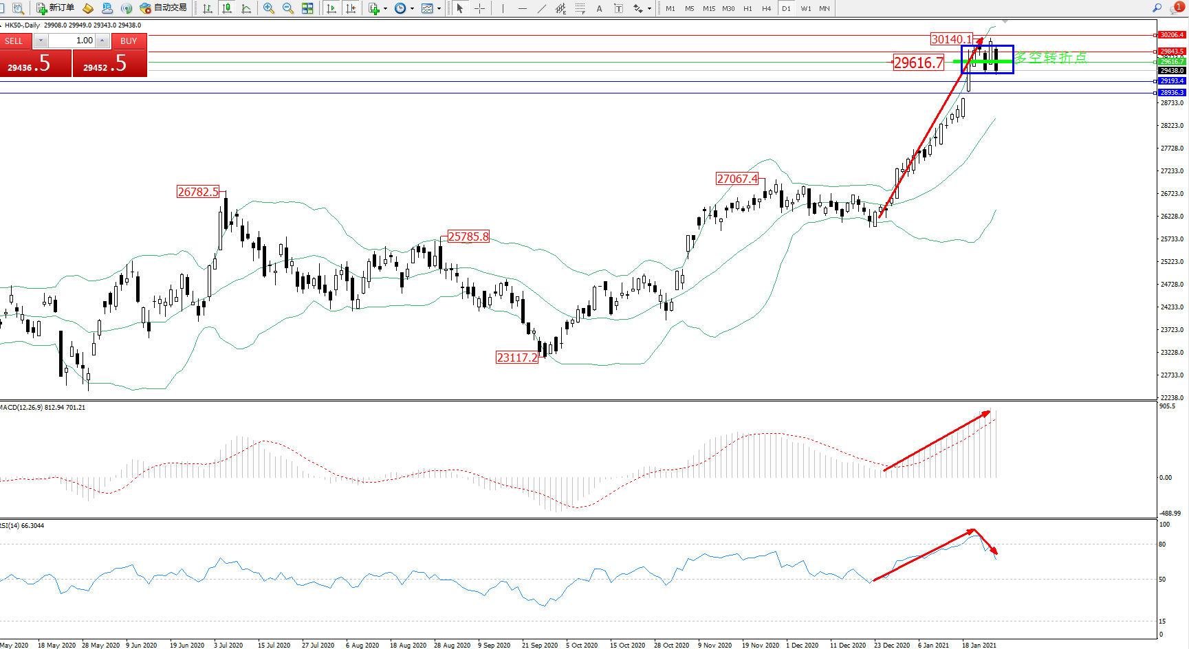 技术点评:多头动力延续布林带指标通道上轨附近持续震荡上扬至30140附近节点后短暂遇阻开始整理,高位短期矩形整理或将持续,布林带指标呈收口走势持续拉升上扬中,MACD指标处于多头区域持续震荡上扬后高位开始疲软徘徊,RSI指标多头动力上行至超买区80均衡线附近震荡后遇阻开始缓慢下移;