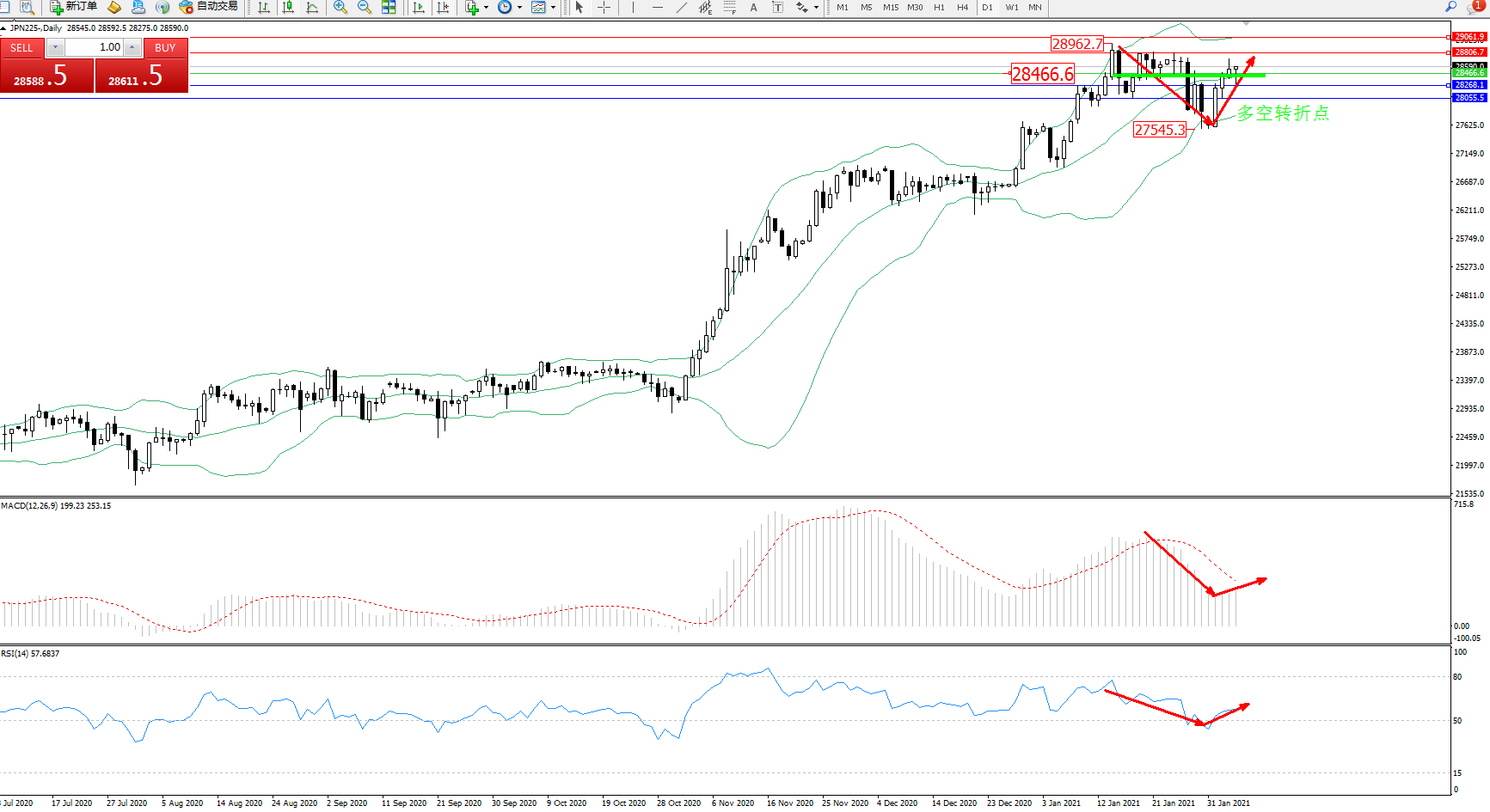 日经225指数2月4日(周四)收盘下跌303.50点,跌幅1.06%,报28343.00点。日本东京新增734例新冠肺炎确诊病例。日本疫情恶化强化了紧急措施,且疫苗注射进度一拖再拖。且全球疫情相关风险情绪的变化也推动着避险资金再度转移阵地。日本国会3日通过两项法案,对不遵守新冠疫情防控措施的个人和企业施以惩罚。共同社报道,上述法案是对应对新冠病毒特别措施法和传染病法的修正案。法案允许政府在未达到紧急状态的情况下宣布进入一种新设的状态,以便采取特别措施遏制病毒传播。按照政府的设想,触发这一状态的前提是,感染人数激增状况达到三级警戒的程度,即四级警戒级别中的次高级。传染病法修正案将对拒绝住院的新冠病患处以最高50万日元(约合3.1万元人民币)罚款,对拒不配合卫生机构流行病学调查的人员处以30万日元(约合1.8万元人民币)罚款。