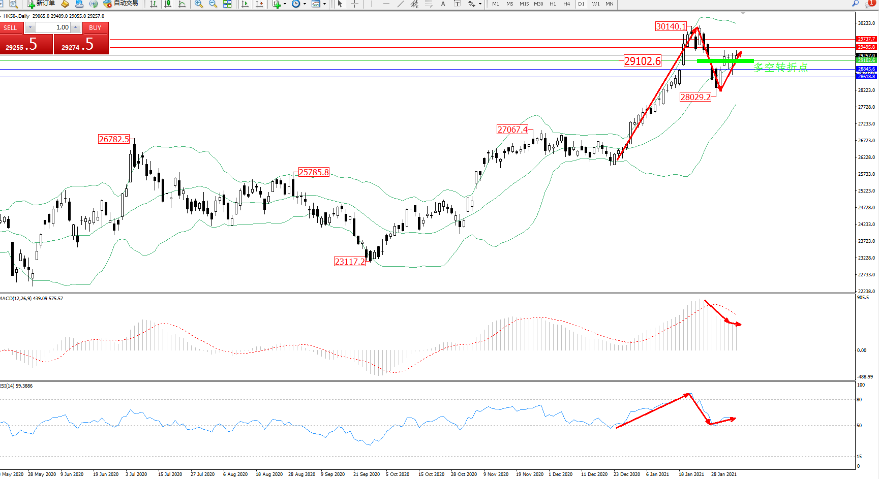 技术点评:多头动力延续布林带指标通道中上轨区间持续震荡上扬至30140位置节点后遇阻开始急速回撤下行,抵达28029位置得到支撑后再度反转向上拉升上扬,处于布林带指标中轨上方震荡数日之久,多空动力短期处于焦灼状态,布林带指标呈收口走势持续中,MACD指标处于多头区域高位震荡回撤后开始走平,RSI指标处于多头区域高位回撤至50均衡线附近节点后得到支撑反转上行中;