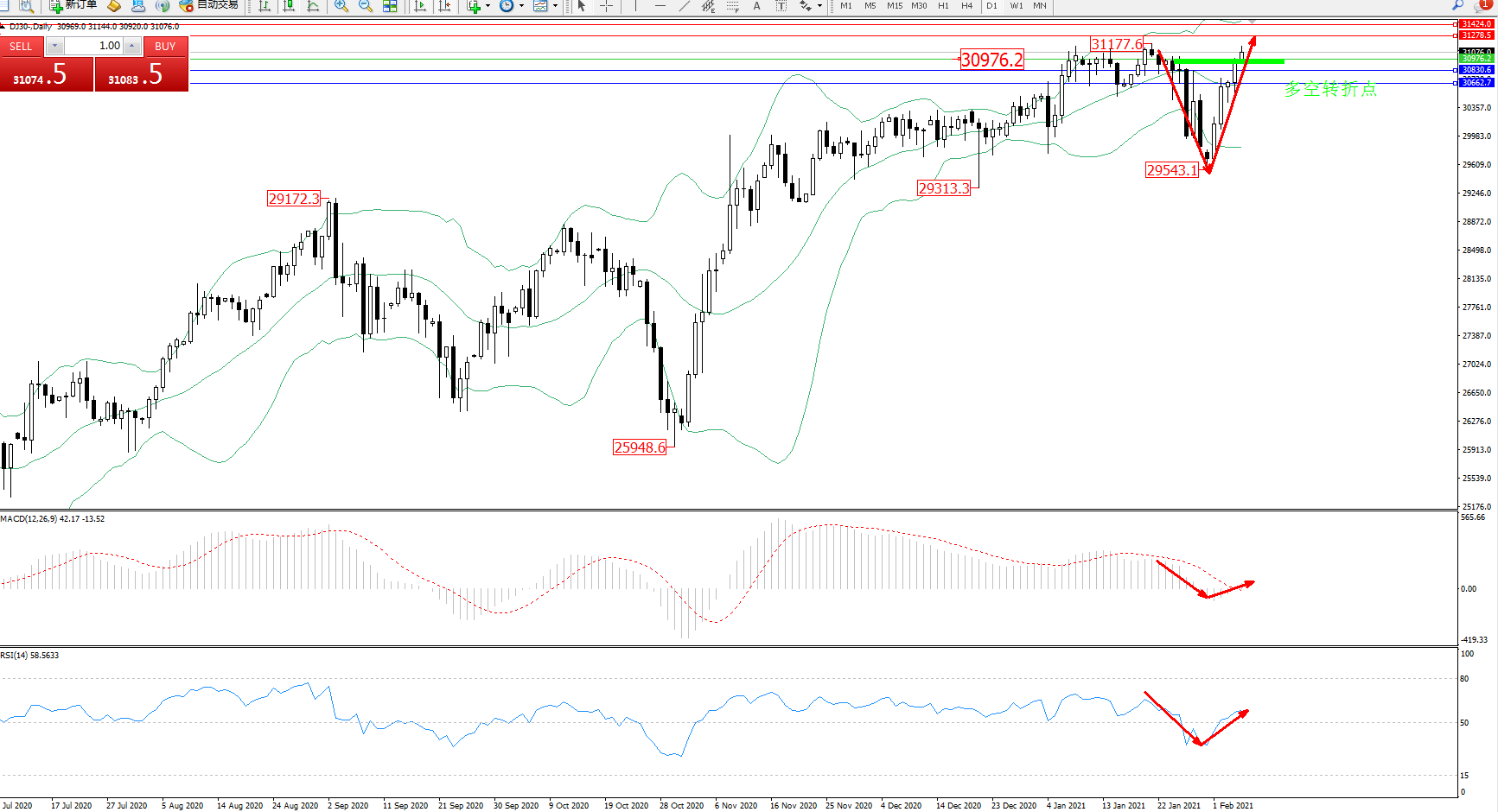 技术点评:高位空头动力急速震荡回撤至29543位置节点后,多头动力强势入场呈V型反转拉升上扬至布林带指标通道中上轨区间震荡,多头有继续向上移动态势,布林带指标呈张口走势后开始缓慢收口走平,关注中上轨区间节点,MACD指标空头动力下行至0轴线下侧后得到支撑开始维持整理平移,RSI指标处于50均衡线附近震荡向上移动中;