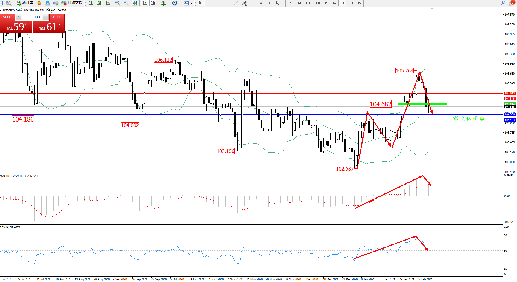 技术点评:多头动力延续布林带指标通道上轨附近持续上行至105.764附近节点,高位遇阻后急速回撤下行,即将触及布林带指标通道中轨附近节点,空头动力有继续向下移动态势,关注中上轨区间关键节点,布林带指标呈张口走势后有收口走势迹象,MACD指标处于0轴线上方多头区域维持整理平移后有下行迹象,RSI指标处于多头区域维持整理后急速下行即将触及50均衡线附近;