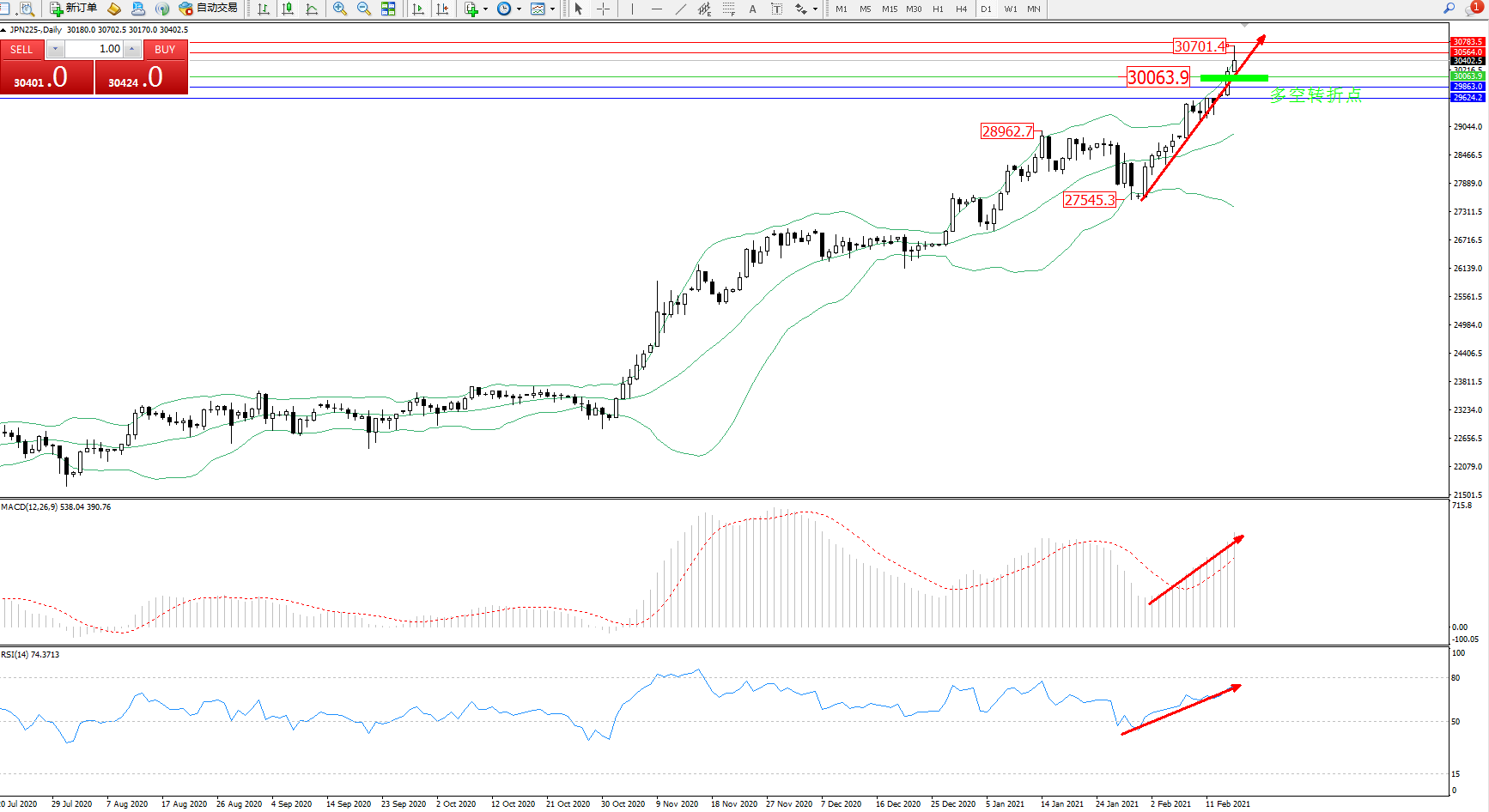 日经225指数2月16日(周二)收盘上涨380.85点,涨幅1.27%,报30465.00点。日经225指数本周自1990年以来首次突破30000点。日本央行对经济前景仍然保持谨慎,风险倾向于下行。日本央行行长黑田东彦称:收益率曲线控制(YCC)项目和负利率不会在评估的时候改变。即使到2023年,日本的通胀也很难达到2%。日本央行的宽松政策并非为了给政府债务融资。没有必要改变2%的通胀目标。日本央行能够退出宽松政策时,政府的借贷成本会上升。长期利率的自然上升可能会推高发债成本,但这是政府必须接受的。日本的银行现在有足够的资本。日本央行的负利率政策有效地将短期利率稳定在-0.1%左右,并将长期利率维持在低水平。正关注长期宽松政策给银行带来的风险。ETF的购买对经济产生了积极影响。日本央行即将进行的评估将探讨如何解决ETF购买的副作用。没有计划持续下调ETF购买规模。