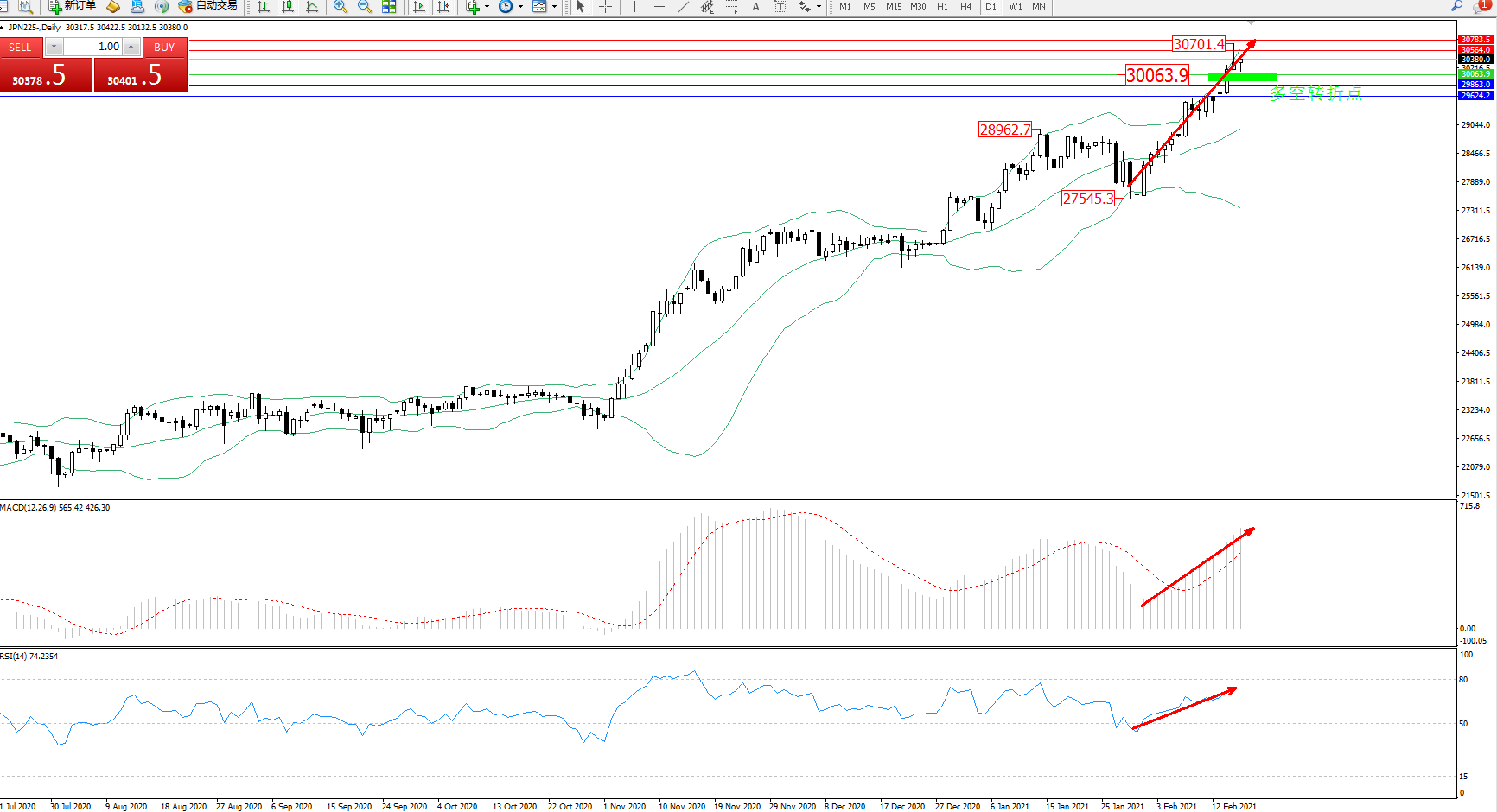 日经225指数2月17日(周三)收盘下跌164.75点,跌幅0.54%,报30303.00点。日本开始对医疗从业者进行新冠疫苗的接种工作。 在东京都目黑区的国立医疗机构东京医疗中心内,院长新木一弘接种了辉瑞制药的新冠疫苗,成为日本首例新冠疫苗接种者。日本政府计划率先在全国100所医院,给自愿接种的4万名医疗从业者先行接种,并在确认疫苗的安全性后,再将接种范围扩大到高龄者和一般人群。日本首相菅义伟:除非地区经济复苏,否则日本无法复苏。股市上涨往往会对经济产生积极影响。股市上涨是件好事,有助于养老金。政府的第三轮额外预算正在帮助经济。日本央行购买ETF并不是为了提高股价。希望日本央行适当地指导政策。日本央行行长黑田东彦解释说,日本央行的ETF购买是货币宽松的一部分,而不是为了引导股价。相信股市上涨会给民众带来广泛好处。