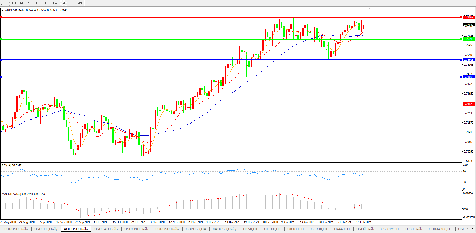 备选策略:0.7680下方看跌,目标0.7560、0.7460