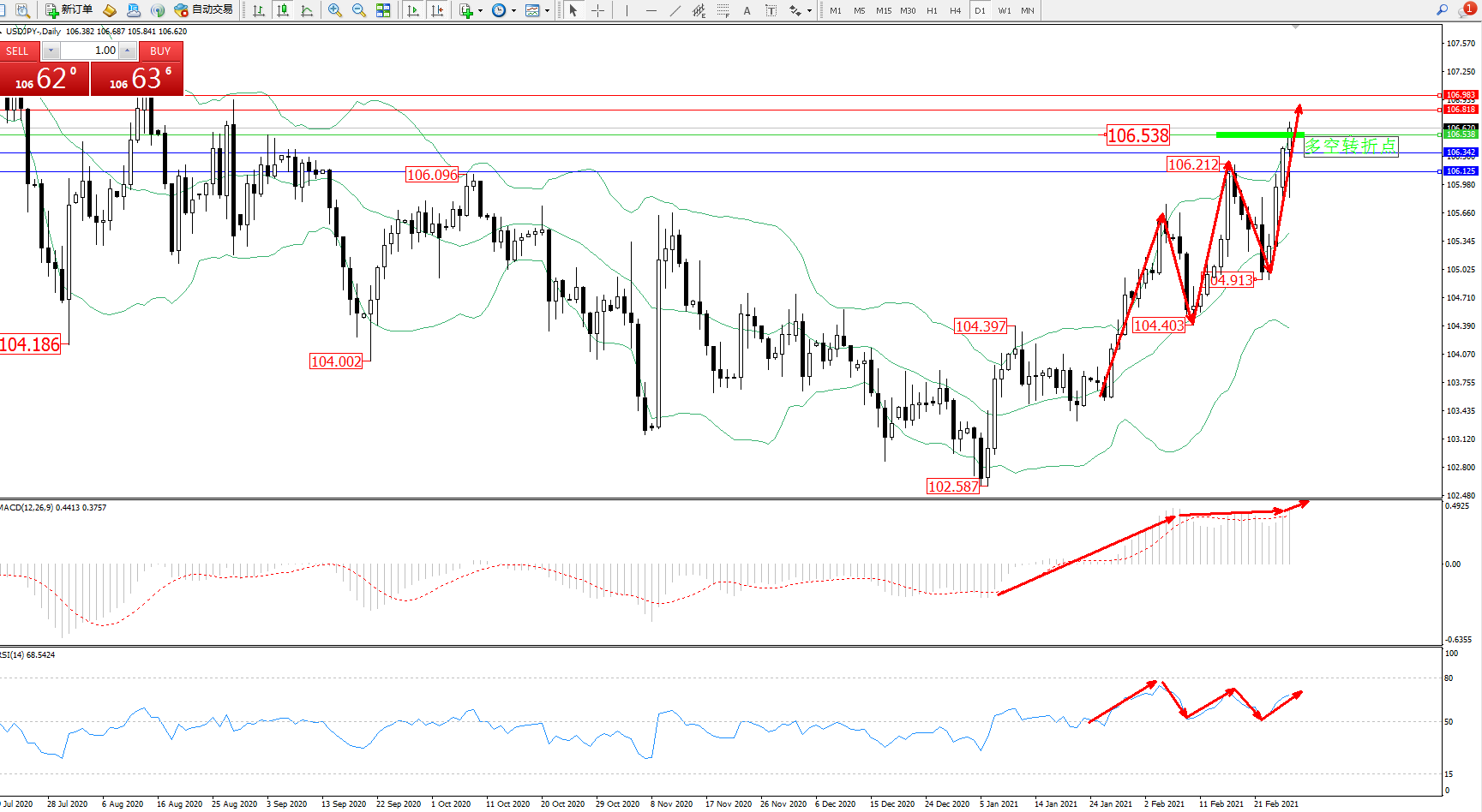 交易策略:106.538上方看涨,目标106.818、106.983