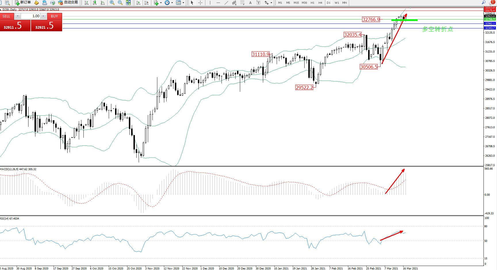 道琼斯指数3月17日(周三)收盘上涨189.29点,涨幅0.58%,报33015.24点;美联储将基准利率维持在0%-0.25%不变,符合市场预期;FOMC委员们一致同意此次的利率决定(与上次会议一致);点阵图预期:预计将维持利率在当前水平直至2023年,与去年12月点阵图一致;上调2021-2022两年的GDP增速预期,下调2023年的GDP增速预期;上调今明后三年的PCE和核心PCE通胀预期,长期PCE通胀预期不变;维持当前资产购买步伐直至充分就业和物价稳定目标取得实质性进展;鲍威尔发布会:美联储坚决致力于实现政策目标,目前的政策立场是适当的;财政政策将加速恢复最大就业,并帮助我们避免留下“伤痕”;不想聚焦于加息时间,希望通胀率在一段时间内适度高于2%;预计很快将看到就业强劲增长,但距离目标还有很长的路要走。