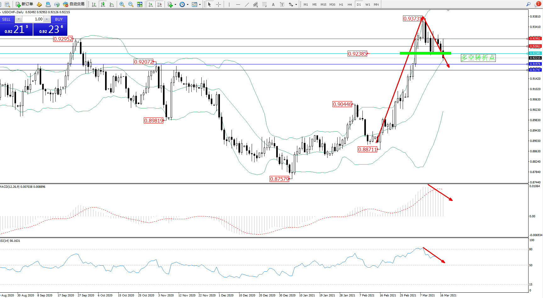 美元兑瑞郎高位回撤至0.92256附近震荡,美联储将基准利率维持在0%-0.25%不变,符合市场预期;美联储上次公布经济预测以来的三个月中,发生了许多事情,包括大规模的财政刺激措施和疫苗加速接种。这在交易员对利率的预期与央行所暗示的未来几年政策行动之间产生了越来越大的鸿沟。美联储3月政策决议措辞整体基调偏向谨慎,虽然承认经济环境改善,但着重指出当前疫情状况仍对经济前景构成巨大威胁,并刻意淡化了疫苗普及应用带来的效果,这使得美元多头势头短线受到打压,不过美联储季度经济报告显示的经济上行趋势,以及点阵图显示有更多美联储官员支持在2023年底之前开始加息的大背景,仍阻止了美元指数进一步下探。而政策决议对于美债收益率上行风险也暂未提及,市场因此正期盼此后美联储主席鲍威尔的新闻发布会讲话提供更多指引。