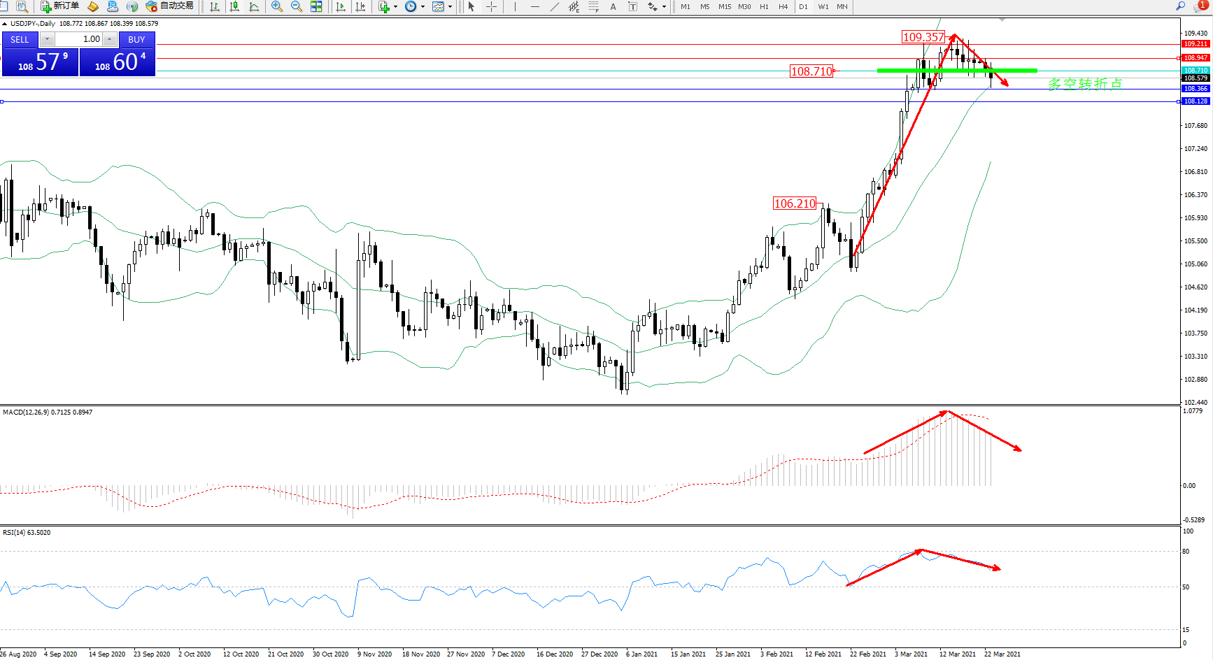 技术点评:多头动力延续布林带指标上轨附近节点持续震荡上扬,高位抵达109.357附近节点后遇阻震荡回撤,触及中轨附近节点后又继续下行迹象,布林带指标呈收口走势中,MACD指标处于多头区域弱势下行,RSI指标处于多头区域维持整理向下移动中;
