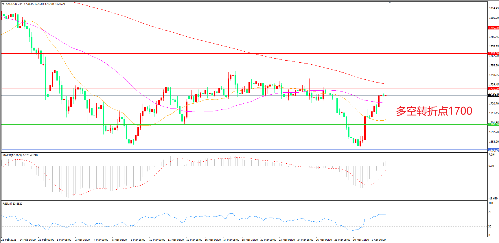 4小时图看,金价回踩1675后大幅反弹,1700关口被突破后,短期走势回暖,200周期均线成为上方阻力,1735成为短期多空分水岭,MACD红柱增加,RSI指标走平,日内震荡上行概率较大。