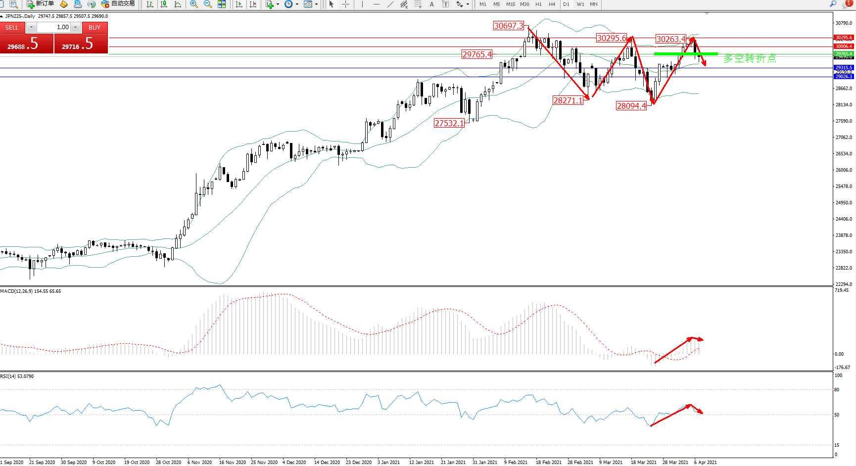 技术点评:长时间维持在布林带指标通道内宽幅震荡持续中,期间多次来回试探上下轨区间节点,多头动力上行至30263位置后遇阻回撤,即将触及布林带指标中轨附近节点,短期或有进一步向下移动迹象,MACD指标处于0轴线上方多头区域维持震荡后有回撤迹象,RSI指标处于50均衡线上方多头区域维持震荡后反转急速下行中;