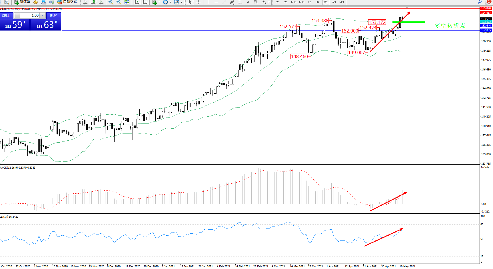 技术点评:长时间维持在布林指标通道宽幅震荡整理持续平移中,延续中上轨区间持续震荡向上移动态势良好,突破前期高位153.388位置后有继续拉升态势,布林带呈张口走势中,MACD指标处于0轴线上方弱势向上移动中,RSI指标处于50均衡线上方震荡拉升中;