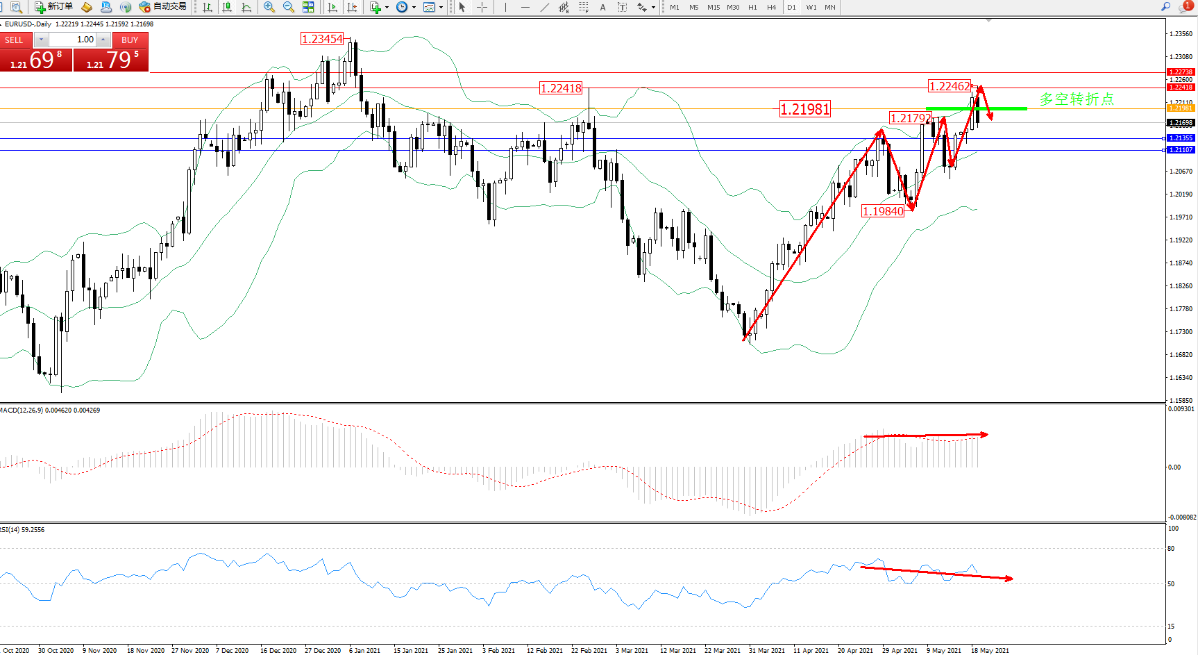 交易策略:1.21981下方看跌,目标1.21355、1.21107
