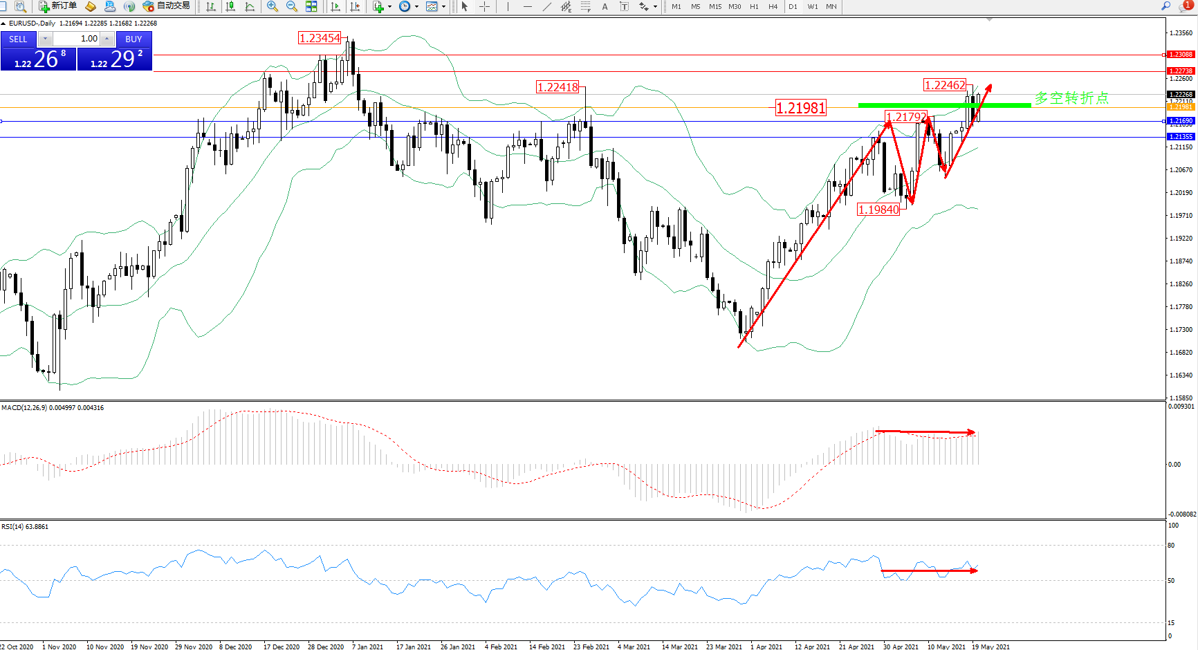 交易策略:1.21981上方看涨,目标1.22738、1.23088