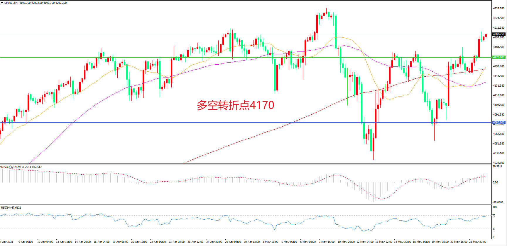 周一(5月24日),投资者关注日内经济数据及美联储官员讲话,同时美债收益率下降及大型科技股纷纷上扬为市场带来提振,标普500大幅走高,收报4197.75点。大型科技股中,涨逾2.9%的谷歌母公司Alphabet领跑,Facebook、微软涨超2%。据悉标普500指数成份股中175家公司在财报电话会议提到了“通胀”一词,创2010年以来新高,后续货币政策的转向依然是市场关心的重点,