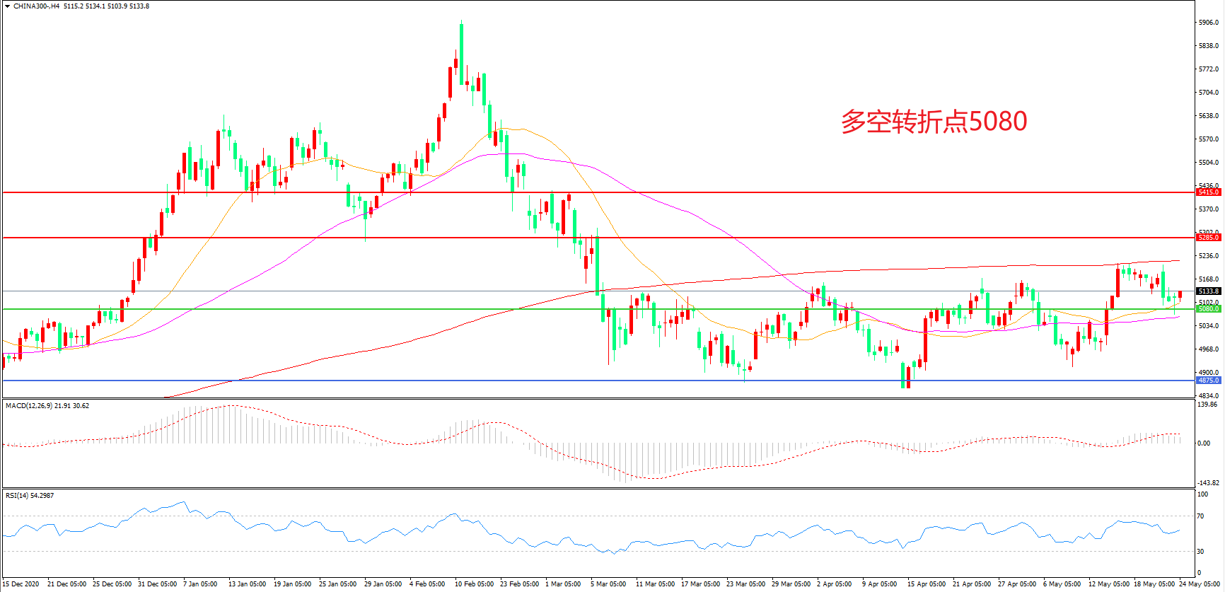 4小时图看,沪深300延续高位整理,区间震荡形态明显,200均线成为上方阻力,21周期均线成为下方支撑,MACD红柱增加,RSI指标向上,日内震荡上行概率较大。