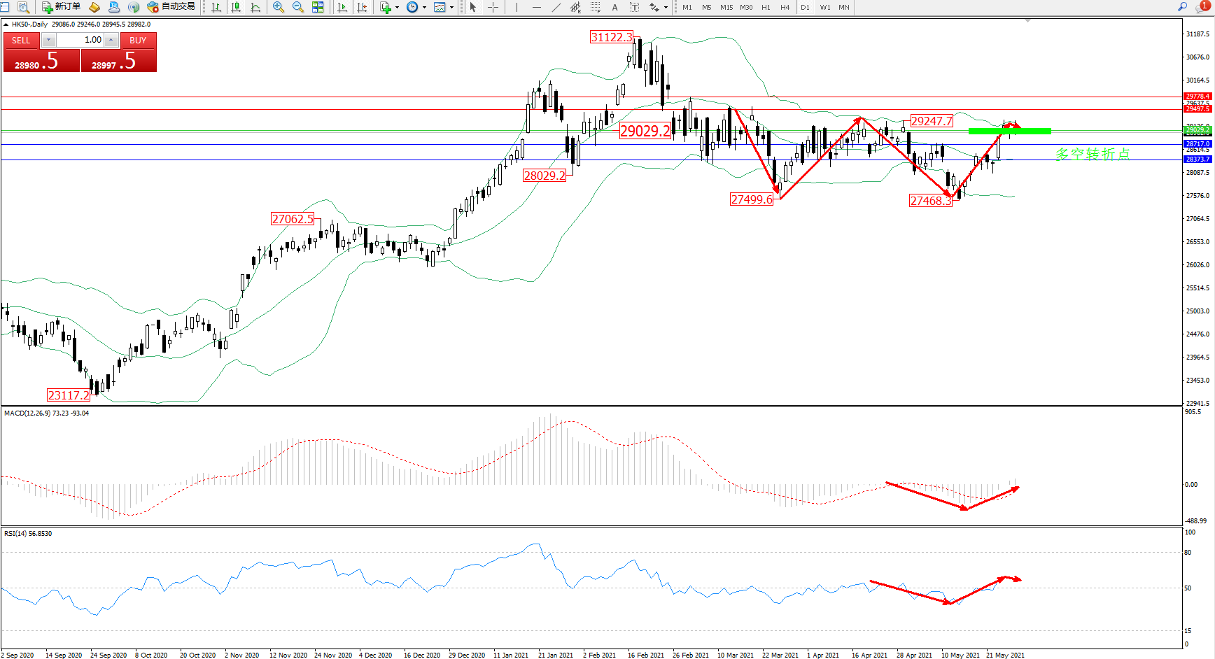 香港恒生指数5月28日(周五)收盘上涨11.21点,涨幅0.04%,报29124.41点;港股午后跳水,恒生科技指数大幅收跌2.05%报7957点,近期极为强势的生物制药股全线回调,康宁杰瑞、基石药业跌超7%;半导体、物管股、SaaS股、煤炭股、区块链股普跌,中芯国际跌2.6%;大型科技股集体下跌,美团、快手跌超2%,腾讯、阿里巴巴、京东等均有跌幅;大金融股走俏,助力恒指小幅收涨。京东物流首日挂牌收涨3.3%,市值达2540亿港元。今日大市成交额为1727亿港元,南下资金净流入2.93亿港元。南下资金今日净卖出18.43亿港元。小米集团-W、中国移动、美团-W分别遭净卖出9.25亿港元、6.7亿港元、4.99亿港元;海吉亚医疗逆市获净买入2.51亿港元。港股本地股集体走强,其中,长实集团涨超6%,莎莎国际和卓悦控股涨超4%,汇丰控股和恒生银行涨超3%,堡狮龙、利福国际、渣打集团涨超2%,港铁、九龙仓置业、利宝阁涨超1%。香港特区政府卫生署卫生防护中心28日公布,截至当日零时,香港没有新增新冠肺炎确诊病例,这是香港连续第二天实现零新增。