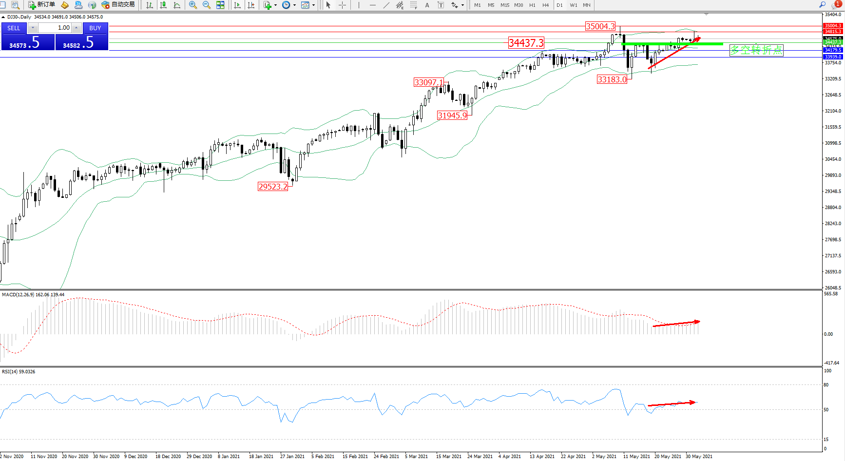技术点评:多头动力延续布林带指标通道中上轨区间持续震荡上扬,高位抵达35004位置后遇阻回撤,长时间维持在中轨上轨弱势徘徊后终究迎来强势拉升,关注中轨附近节点,布林带指标呈收口平移走势良好,MACD指标处于多头区域高位维持震荡向下移动后弱势徘徊,RSI指标处于50均衡线上方不断震荡平移中;