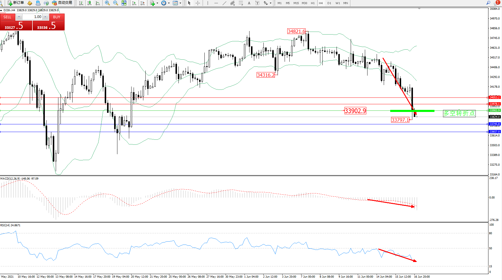 道琼斯指数6月16日(周三)收盘下跌264.54点,跌幅0.77%,报34034.79点;北京时间周四凌晨2点整,美联储公布最新的6月利率决议,美联储维持利率0-0.25%不变,符合预期。美联储指出,将继续每月增持至少800亿美元的国债和至少400亿美元的住房抵押贷款支持证券,直到委员会的充分就业和物价稳定目标取得实质性进展,将超额准备金利率(IOER)从0.1%调整至0.15%。到2023年底,美联储将加息两次。 13名委员预计在2023年开始加息,今年3月为7名委员。7名委员预计在2022年开始加息,今年3月为4名委员。