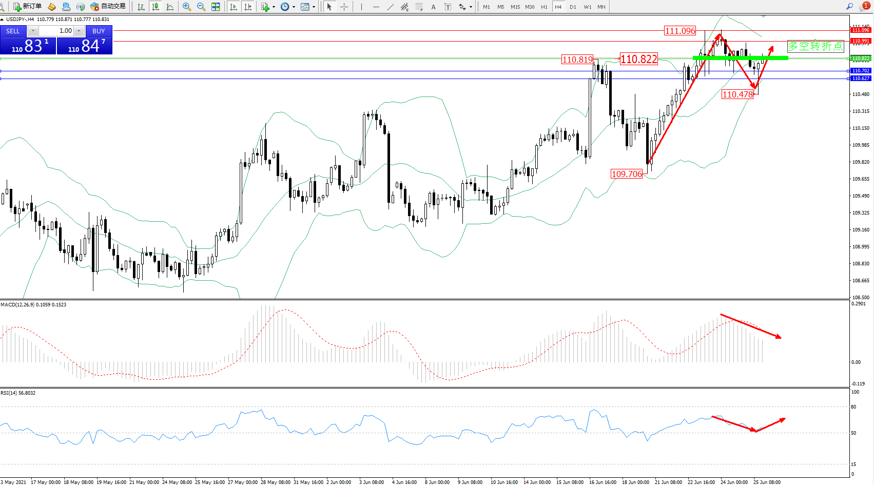 技术点评:多头动力延续布林带指标中轨附近持续拉升至111.096位置后遇阻,缓慢震荡回撤至110.478位置后得到支撑反转上扬,纠结于布林带指标中轨附近节点开始震荡,短期或将维持在中轨附近徘徊,布林带指标呈收口走势持续中,MACD指标处于多头区域高位弱势震荡回撤后有平移迹象,RSI指标处于多头区域震荡回撤至50均衡线上方弱点徘徊;