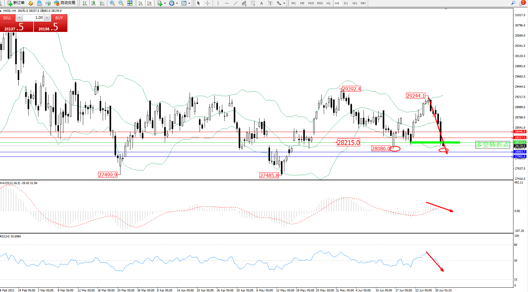 技术点评:高位空头动力急速下挫,触及布林带指标下轨附近节点后有继续下行迹象,前期低位28086位置近在咫尺破位在即,空头动力有进一步向下移动态势,布林带指标呈张口走势持续中,MACD指标纠结于0轴线附近震荡后进入空头区域弱势下行中,RSI指标空头动力跌破50均衡线进入空头区域持续下探中;
