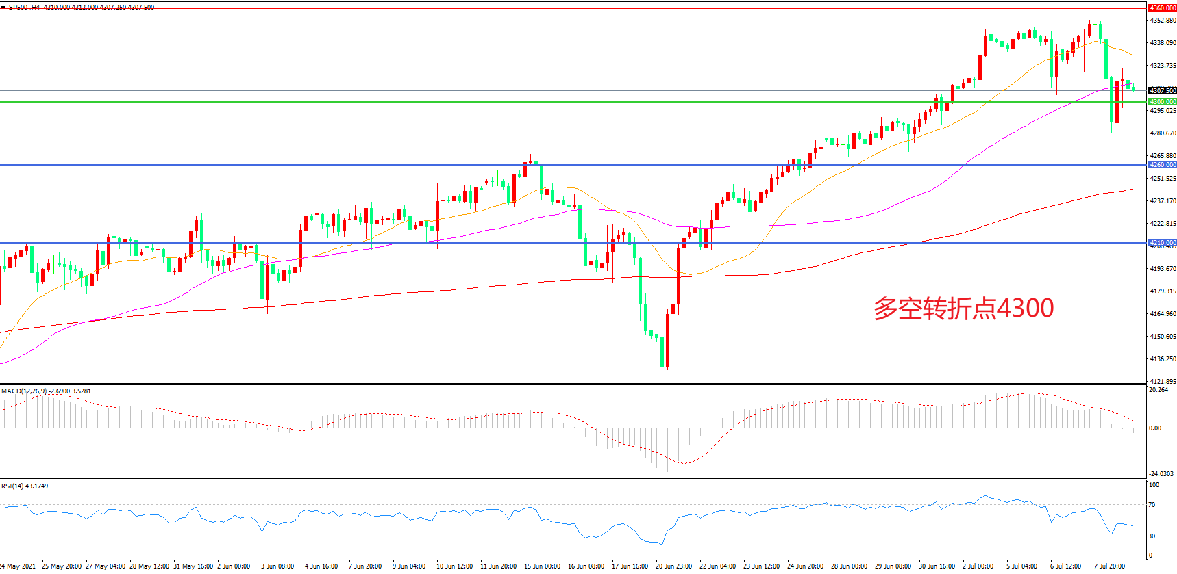4小时图看,标普500长阴下破,短线行情有所回调,但上升形态依然完好,4300一线成为短线多空分水岭,均线系统逐渐走平,MACD绿柱增加,RSI指标走平,日内延续震荡概率较大。