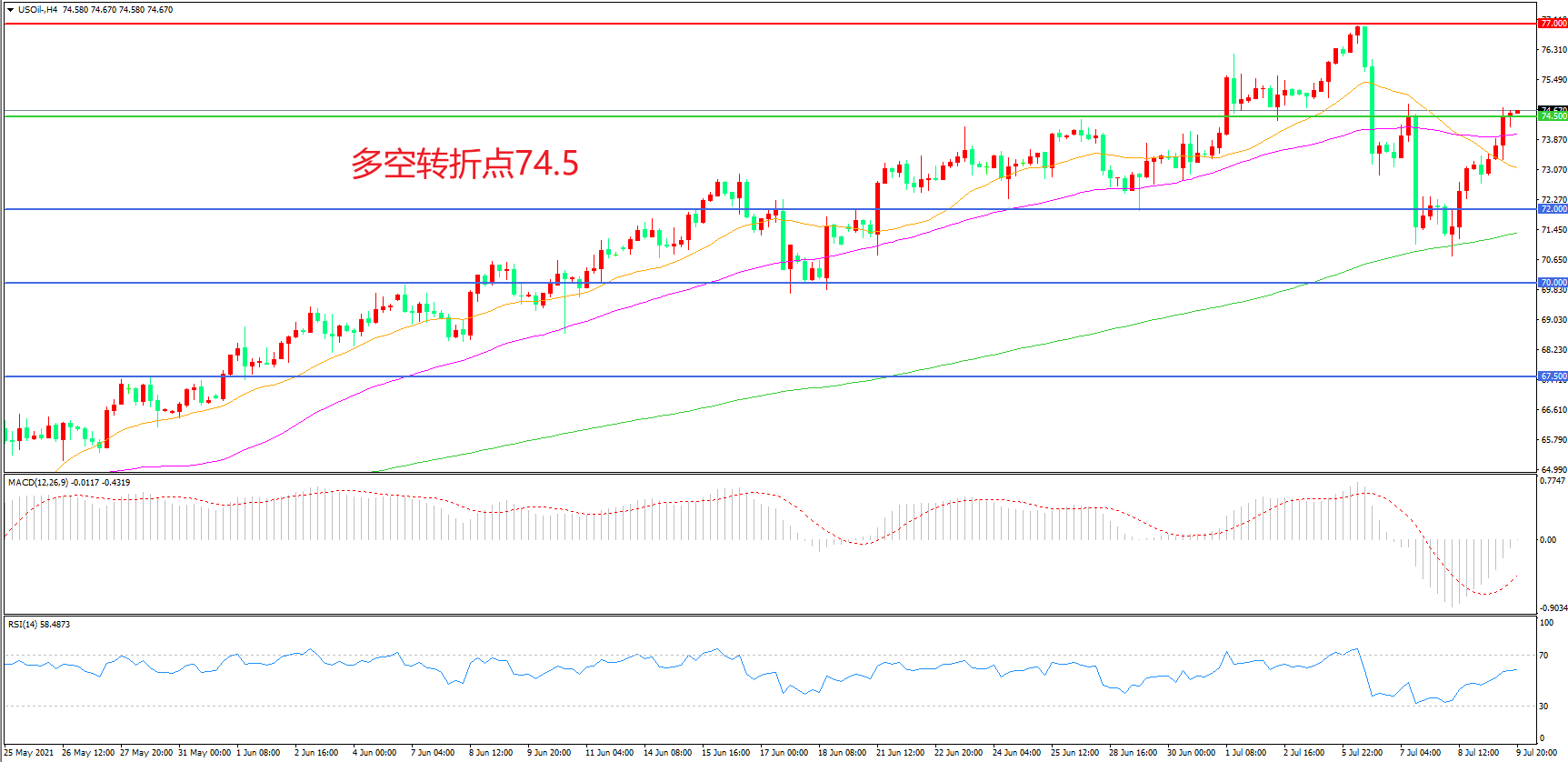 交易策略:在74.50之上看涨,目标77.00 80.00
