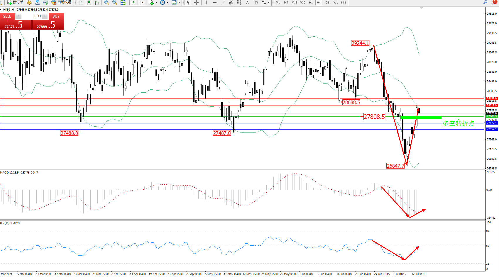 技术点评:空头动力急速下挫后,低位抵达26847位置强势反转呈V型走势拉升上扬,触及布林带指标中轨附近节点后开始整理,布林带指标呈收口走势持续中,短期或维持在中轨附近整理中,MACD指标空头动力震荡下行后反转向上回升中,RSI指标低位多头动力持续震荡上移至50均衡线附近徘徊;
