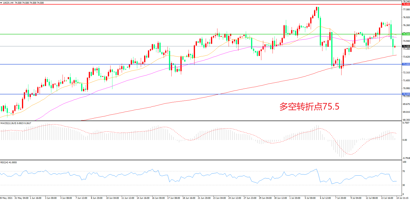 4小时图看,油价长阴下破,前期涨幅被吞噬殆尽,75.5美元成为短期多空分水岭,均线系统粘合形成上方阻力,MACD红柱减少,RSI指标走平,日内震荡下行概率较大。