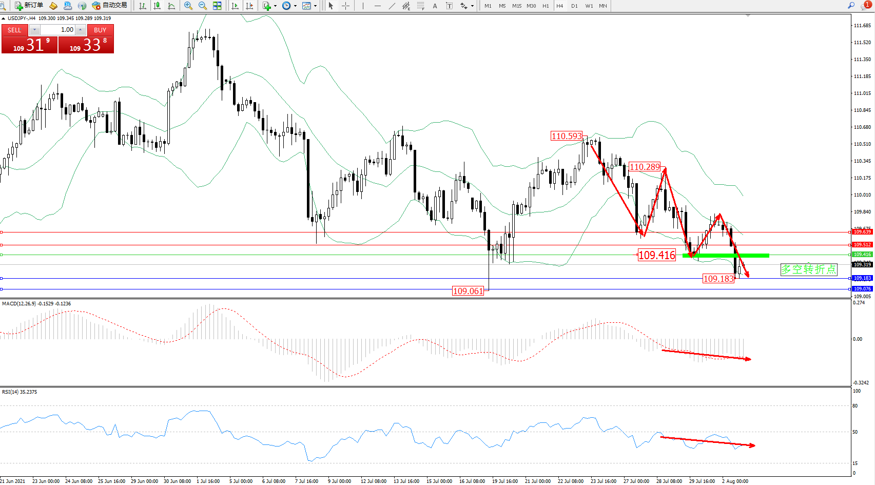 技术点评:空头动力延续布林带指标通道中下轨区间持续震荡向下移动中,低位抵达109.183位置后不断向下移动,跌势未见止步迹象,布林带指标呈下行趋势走势态势良好,前期低位109.061位置近在咫尺破位在即,MACD指标处于空头区域维持震荡平移,RSI指标处于空头区域持续徘徊中;