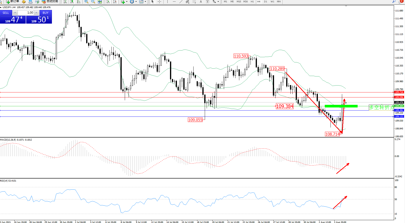 技术点评:空头动力延续布林带指标通道中下轨区间持续震荡下行,低位抵达108.714位置后得到支持强势拉升,突破布林带指标中轨附近节点进入中上轨区间震荡,多头动力有进一步上移迹象,布林带指标呈下行趋势走势后开始有反转走平迹象,MACD指标处于空头区域低位震荡缓慢上移,RSI指标处于空头区域震荡急速回升至50均衡线上側弱势徘徊;