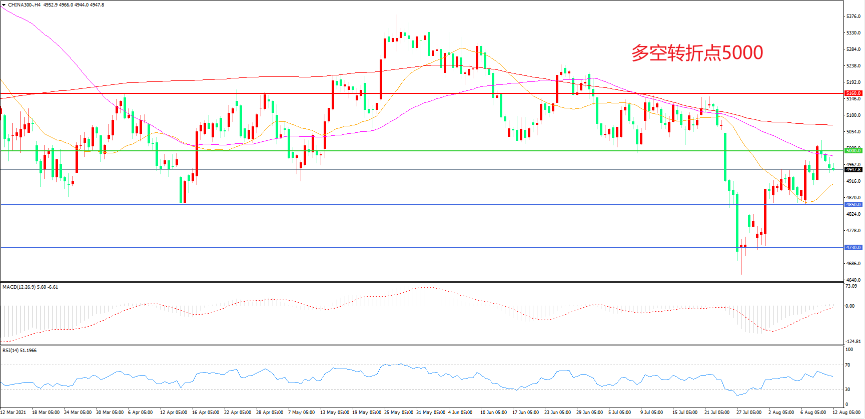 4小时图看,沪深300大幅反弹后受阻于5000点附近阻力,上行势头受阻,55均线成为短期阻力,MACD绿柱缩短,日内延续震荡概率较大。