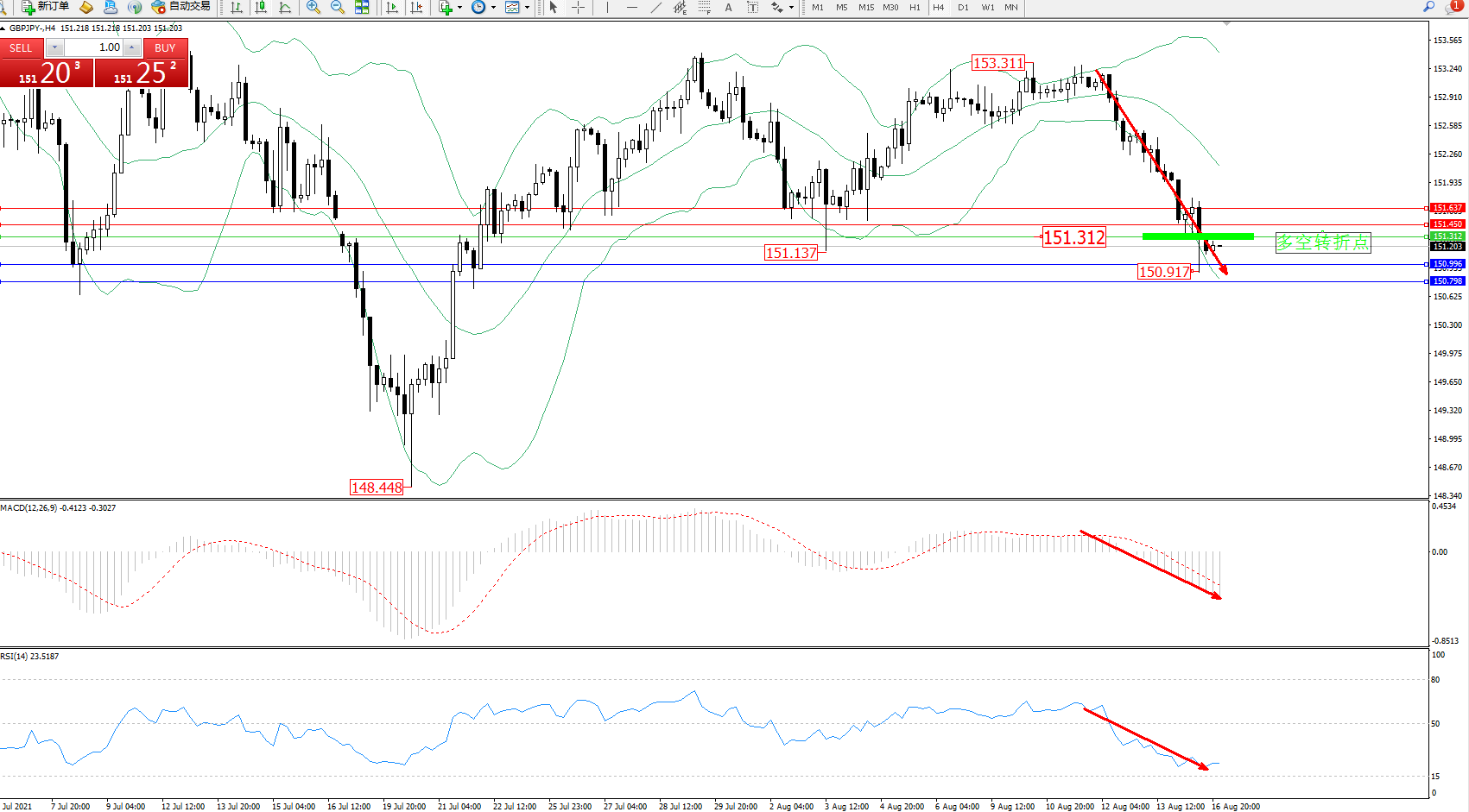 技术点评:空头动力延续 布林带指标通道下轨附近持续震荡下行,低位抵达150.917位置开始短暂震荡,高位空头弱势下行态势良好,且未见止步迹象,布林带指标呈张口走势持续震荡,有短暂开始收口迹象,MACD指标处于空头区域持续震荡向下移动中,RSI指标处于空头区域维持震荡不断下移后开始低位徘徊;