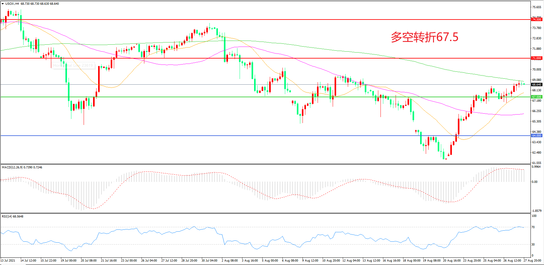交易策略:在67.50之上看涨,目标71.00                74.50